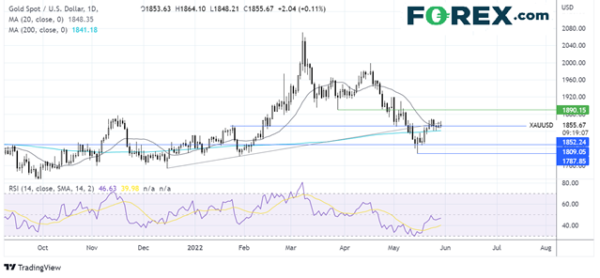 Forex.Com表示,黄金价格继续在200日均线上方交易,金价最近在20日均线1849美元/盎司找到支撑,使黄金可以看向上周高点1870美元/盎司。如果升穿该水平,这可能推动金价涨向3月30日低点1890美元/盎司。