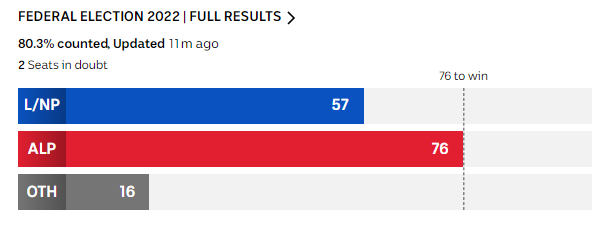 FX168财经报社(香港)讯 澳大利亚工党成功拿下众议院过半席位组建多数派政府,31日将公布内阁人选。据澳媒最新数据,工党已经在联邦大选中拿下76个众议院席位,达到组成多数派政府的席位要求,目前还有2个席位计票尚未结束。预计工党会在众议院中与独立议员和绿党合作,加速各项法案通过的进程。