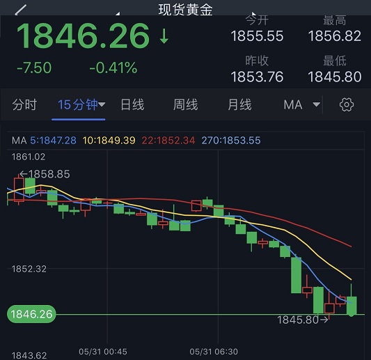 香港时间09:42,现货黄金报1846.26美元/盎司。