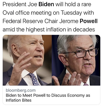 金融博客Zerohedge称,“拜登召见鲍威尔,是否意味着他最终意识到市场崩盘、房地产自由落体和经济衰退比恶性通货膨胀更糟糕?”
