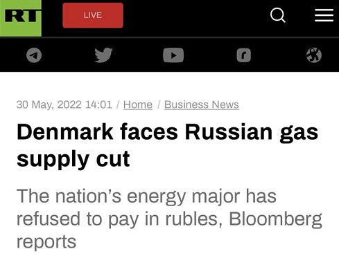 RT称,如果拒绝接受俄罗斯的卢布付款要求,丹麦可能成为紧接荷兰之后,下一个被俄罗斯中断天然气供应的国家。