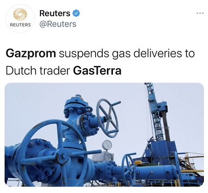 俄气发布公告指出:“截至5月30日工作日结束时(合同规定的付款日期),俄气仍没有从GasTerra处收到4月所供天然气的货款。俄气因此通知GasTerra将从2022年5月31日起暂停供气,直到GasTerra按照前述命令规定的办法进行付款为止。”
