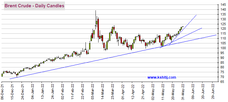 原油方面,Kshitij咨询服务团队表示,布伦特原油期货和WTI原油期货如预期的那样进一步上涨,这是受欧洲昨日达成的禁止进口俄罗斯石油的协议以及中国解除新冠肺炎限制后需求可能上升的推动。目前油价前景看涨。短期内,布油和WTI油价存在分别进一步涨向125美元/桶和120美元/桶的空间。如果进一步突破上述水平,那么中期前景将看涨。