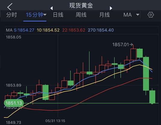 香港时间17:20,现货黄金报1851.13美元/盎司。