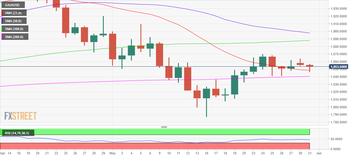 24K99讯 周二(5月31日)欧市早盘,美元指数延续升势,现报101.75附近。现货黄金短线大跌,目前正逼近1850美元/盎司关口。知名财经网站FXStreet分析师Dhwani Mehta周二最新撰文,对金价技术前景进行分析。Mehta指出,若日收盘位于200日均线下方,金价后市恐进一步重挫。