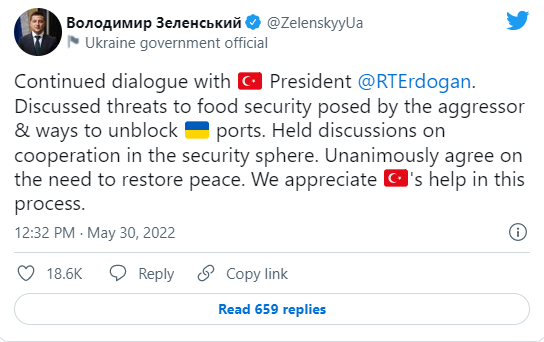 据悉,俄罗斯和土耳其在周一的电话中讨论了黑海运输问题,俄罗斯称其愿意确保乌克兰的出口,但没有提供细节。