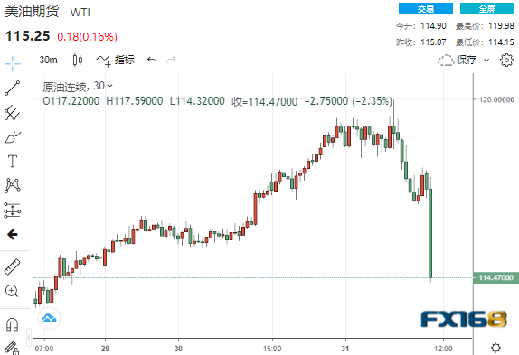 这一消息传来之后,美、布两油短线跌幅扩大至逾3美元,现分别报114.15美元/桶和112.92美元/桶。