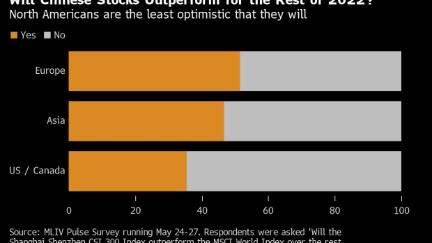 与此同时,56%的受访者预计,今年迄今下跌19%的沪深300指数将在2022年以亏损告终。大多数受访者还预计,该指数将落后于追踪发达市场主要股票的摩根士丹利资本国际世界指数(MSCI World Index),而美国市场的看跌情绪仍然高企。
