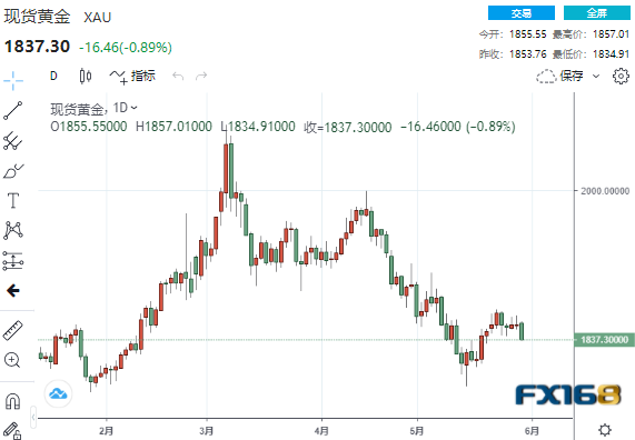 美市尾盘,现货黄金收报1837.30美元/盎司,下跌16.46美元或0.89%,日内最高触及1857.01美元/盎司,最低触及1834.91美元/盎司。5月份,现货黄金大跌59.72美元或3.15%。