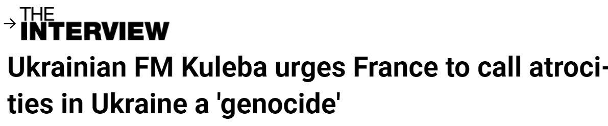 当被问到本周乌克兰总统泽连斯基与马克龙总统之间就使用“种族灭绝”一词来描述乌克兰事件的争执时,库列巴说道:“现在是法国及其总统将正在发生的事情称为‘种族灭绝’的时候了。”