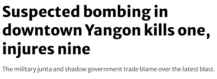 缅甸有大约20支少数民族叛军,其中许多控制着偏远边境地区,数十年来他们为毒品贸易、自然资源和自治权互斗并与军方对抗。另外,缅甸旧都仰光一处繁忙地区周二发生炸弹爆炸,造成1人死亡,9人受伤。