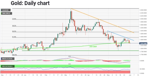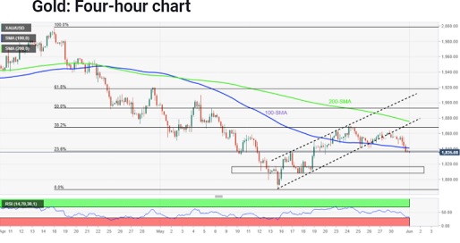24K99讯 周三(6月1日)亚市盘中,现货黄金维持跌势,目前金价跌至1834美元/盎司附近。知名财经网站FXStreet分析师Anil Panchal周三最新撰文,对金价技术前景进行分析。根据Panchal,金价有效跌破关键的200日均线,这预示金价后市将进一步下滑。