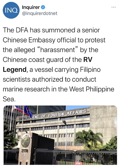 菲律宾外交部周二表示,外交部已经召见中国大使馆的一名高级官员,抗议中国海警船在菲律宾领海内骚扰当时正进行菲律宾和台湾联合海洋研究任务的台湾“励进号”研究船(RV Legend),对中国海警总队骚扰和侵犯菲国海事管辖权表达不满。