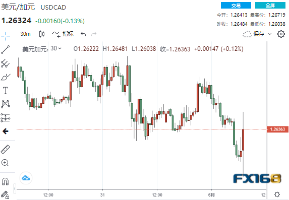 (美元/加元30分钟走势图,来源:FX168)