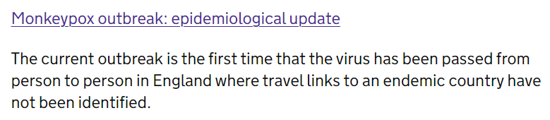 UKHSA指出,目前的疫情是猴痘病毒首度在英格兰人传人,且尚未确定与主要国家旅游史之间的关联。根据该机构截至5月31日的疫情数据,英国累计190例确诊病例中,132例在伦敦,而已知111例是同性恋者、双性恋者或其他男男性行为者,只有2例发生在女性身上。此外,其中34例在出现症状后的21天内曾到欧洲多个不同国家旅行。