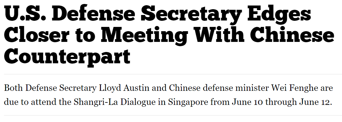 彭博社报道称,若美中双方幕僚谈妥,美国国防部长奥斯丁(Lloyd Austin)可能在香格里拉对话期间,与中国防部长魏凤和会面。五角大厦前官员、美国企业研究所(American Enterprise Institute)高级研究员库伯(Zack Cooper)表示:“华府似乎已认定,与北京沟通并尝试建立能减少冲突可能的护栏(guardrails),要比争论谁才适合对话更重要。”