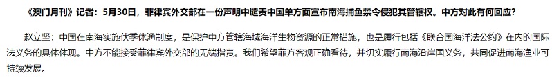 中国外交部发言人赵立坚在6月1日的新闻发布会上表示,中国在南海实施伏季休渔制度,是保护中方管辖海域海洋生物资源的正常措施,也是履行包括《联合国海洋法公约》在内的国际法义务的具体体现。中方不能接受菲律宾外交部的无端指责。