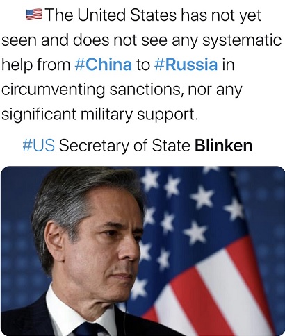 与此同时,布林肯表示,截至到今天的情况,华盛顿“从中方那里没有记录到系统支持俄罗斯规避制裁的努力,也没有任何实质性的军事支持。”