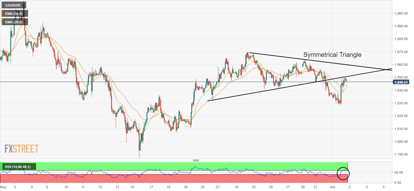FXStreet提到,在每小时的尺度上,黄金价格在对称三角形的上升趋势线周围面临障碍,对称三角形从5月20日的低点1832.41美元开始,而下降趋势线从5月24日的高点1869.75美元开始绘制。