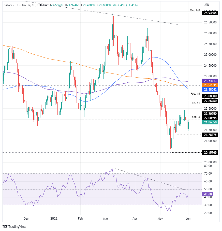 24K99讯 周四(6月2日)亚市盘中,现货白银重回跌势,目前交投在21.75美元/盎司附近。知名财经网站FXStreet分析师Christian Borjon Valencia最新撰文,对银价技术前景进行分析。根据Valencia,假如银价跌破短期支撑21.43美元/盎司和21.28美元/盎司,后市可能进一步大跌。