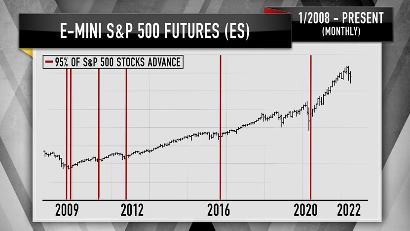 克莱默说,垂直的红线表示指数上涨95%的时刻。他指出,自2008年以来,在上周之前出现了六次抛售,每一次都是买入机会。