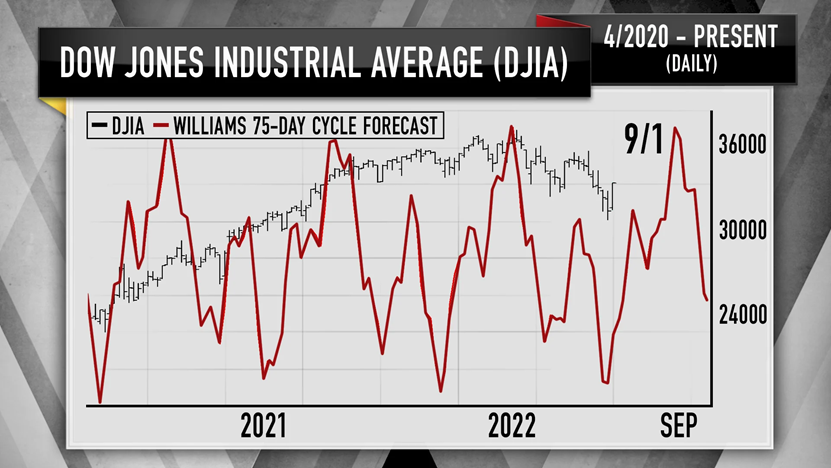 Williams还注意到另一种模式——这是一个主导道琼斯指数的75天周期——根据克莱默的说法,这表明市场将在9月1日之前出现反弹。