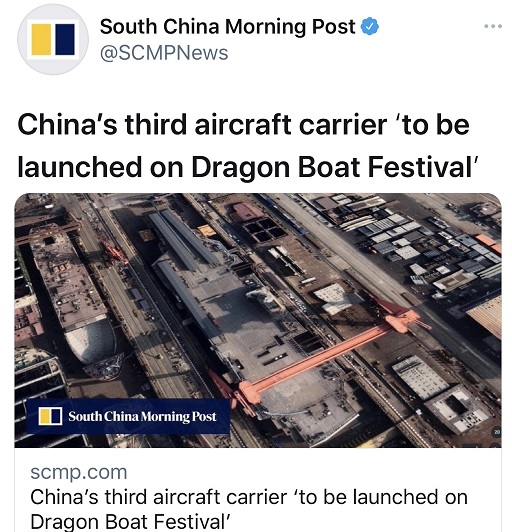 一位熟悉中国航母项目的军方内部人士告诉《南华早报》,下水将在端午节进行——这证实了社交媒体上的猜测。