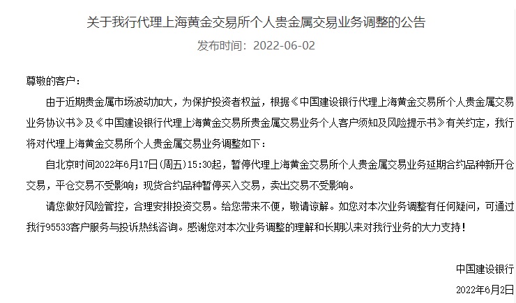 24K99讯 6月3日,中国建设银行发布关于该行代理上海黄金交易所个人贵金属交易业务调整的公告。