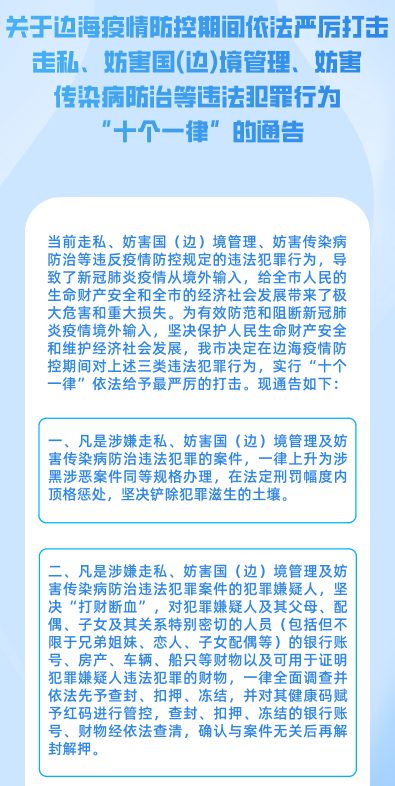 当前走私、妨害国(边)境管理、妨害传染病防治等违反疫情防控规定的违法犯罪行为,导致了新冠肺炎疫情从境外输入,给全市人民的生命财产安全和全市的经济社会发展带来了极大危害和重大损失。为有效防范和阻断新冠肺炎疫情境外输入,坚决保护人民生命财产安全和维护经济社会发展,我市决定在边海疫情防控期间对上述三类违法犯罪行为,实行“十个一律”依法给予最严厉的打击。现通告如下: