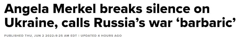 默克尔在发表评论前表示,作为旁观者她不想提供建议,她将俄罗斯入侵乌克兰描述为“野蛮的侵略战争”,这构成了“影响深远的转折点”,是二战以来欧洲“最明显的违反国际法”的行为。