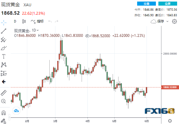 美市尾盘,现货黄金收报1868.52美元/盎司,上涨22.62美元或1.23%,日内最高触及1870.36美元/盎司,最低触及1843.83美元/盎司。