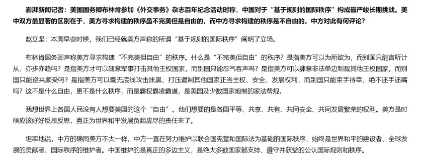 中国外交部发言人赵立坚回应称,本周早些时候,我们已经就美方声称的所谓“基于规则的国际秩序”阐明了立场。布林肯国务卿声称美方寻求构建“不完美但自由”的秩序。什么是“不完美但自由”的秩序?是指美方可以为所欲为,而别国只能言听计从、亦步亦趋吗?是指美方才可以随意军事打击其他主权国家,而别国只能忍气吞声吗?是指美方可以肆意非法单边制裁其他主权国家,而别国只能逆来顺受吗?是指美方可以毫无底线攻击抹黑、打压遏制其他国家正当主权、安全、发展权利,而别国只能束手待宰,绝不还手还嘴吗?这不是什么自由,更不是什么秩序,而是霸权霸凌霸道,是美国及少数国家炮制的家法帮规。