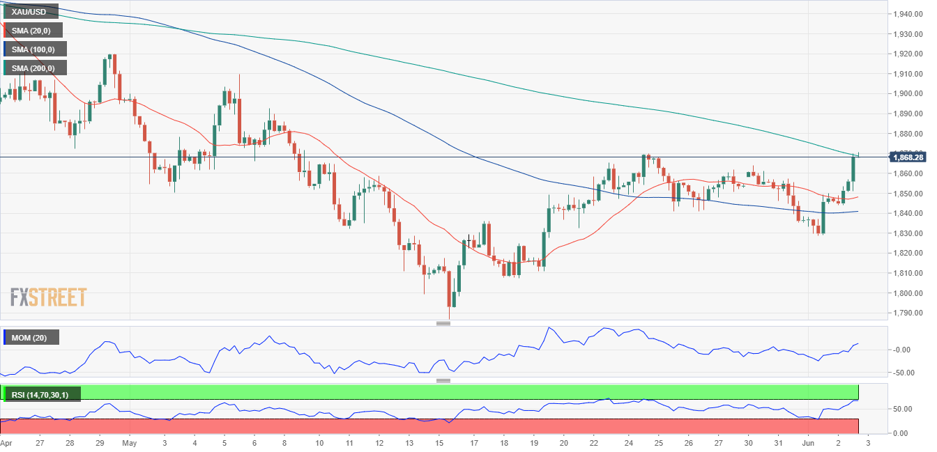 24K99讯 周五(6月3日)亚市盘中,现货黄金保持坚挺,金价目前交投在1871美元/盎司附近;昨日金价飙升逾20美元。FXStreet首席分析师分析师Valeria Bednarik最新撰文,对金价技术前景进行分析。Bednarik指出,黄金技术面看多,一旦突破首个阻力1871.50美元/盎司,金价可能会扩大涨幅。
