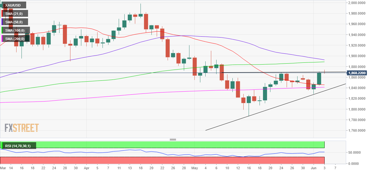 24K99讯 周五(6月3日)欧市盘中,现货黄金小幅回落,目前交投在1866美元/盎司附近。知名财经网站FXStreet分析师Dhwani Mehta周五最新撰文,对金价走势进行分析。