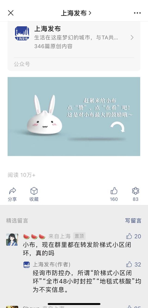 有网友在上海发布评论区提问:“现在群里都在转发阶梯式小区闭环,真的吗”,对此,上海发布回应称:经询市防控办,所谓“阶梯式小区闭环”“全市48小时封控”“地毯式核酸”均为不实信息。