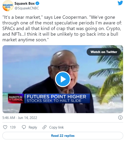 库珀曼说:“我认为,我们已经经历了我所知的最具投机性的时期之一,你知道,特殊目的收购公司(SPAC)和所有这类垃圾,加密货币和NFT(非同质化代币)等诸如此类的东西。”