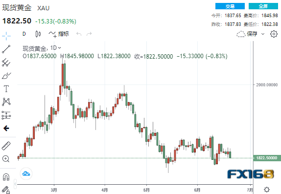 美市尾盘,现货黄金收报1822.50美元/盎司,下跌15.33美元或0.83%,日内最高触及1845.98美元/盎司,最低触及1822.38美元/盎司。