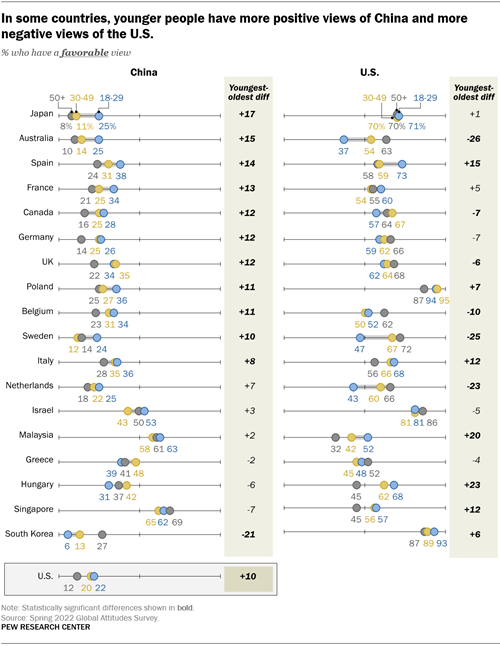 总体而言,一些国家的年轻人——包括澳大利亚、比利时、加拿大、瑞典和英国——对中国的态度比老年人更积极,对美国的态度则不那么积极。在接受调查的国家中,韩国是唯一一个年轻人对中国的负面看法多于老年人,对美国的正面看法多于年轻人的国家。