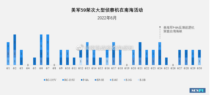 FX168财经报社(香港)讯 长期关注美军动态的中国半官方机构、智库“南海战略态势感知计划”周五(7月1日)最新表示,2022年6月,美军累计出动59架次大型侦察机前往南海对中国进行抵近侦察,较5月美军机侦察强度大幅增加。