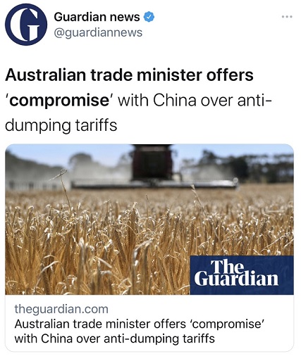《卫报》报道称,澳大利亚抱怨中国对包括肉类、小龙虾、木材和煤炭在内的一系列出口商品实施贸易制裁,目前正就中国对澳大利亚葡萄酒和大麦征收反倾销税问题向世贸组织提出申诉。黄英贤誓言,要抓住一切机会要求中方取消所谓“不正当的贸易攻击”。