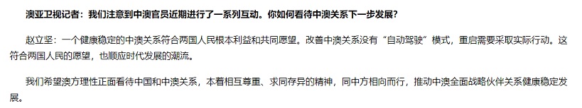 赵立坚表示,一个健康稳定的中澳关系符合两国人民根本利益和共同愿望。改善中澳关系没有“自动驾驶”模式,重启需要采取实际行动。这符合两国人民的愿望,也顺应时代发展的潮流。