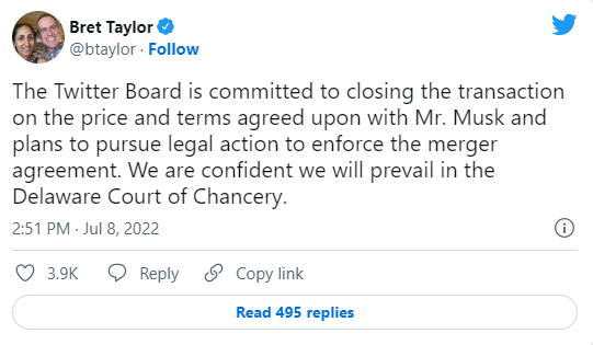 但推特董事会主席泰勒表示,该公司仍将致力于以商定的价格完成交易,并计划采取法律行动来执行该协议。