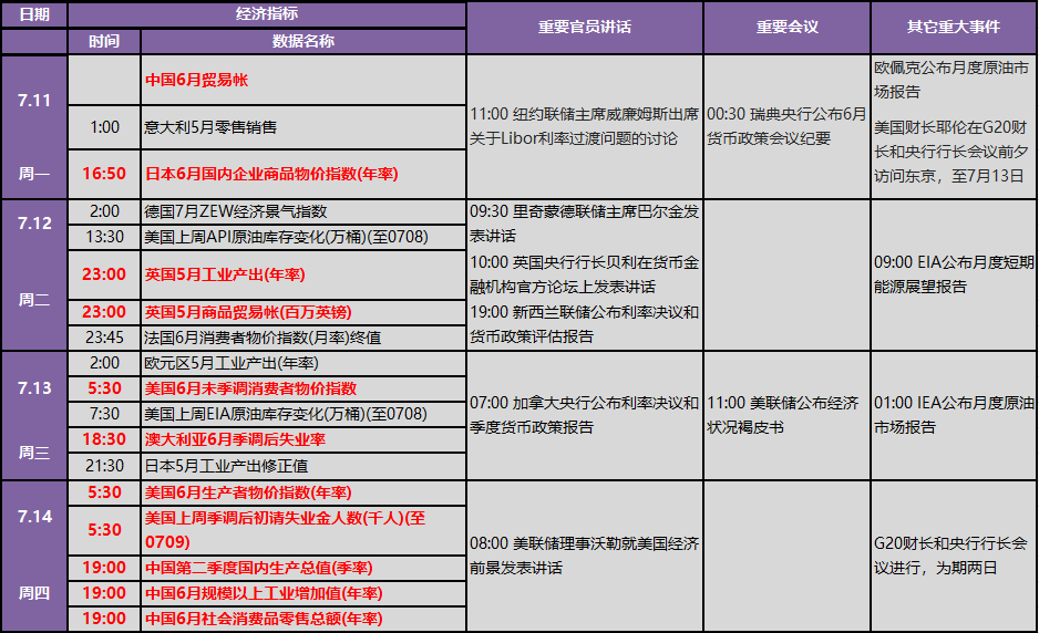 同时下周市场还将迎来加拿大央行公布利率决议和季度货币政策报告、新西兰联储公布利率决议和货币政策评估报告,以及美国初请失业金报告和美国生产者物价指数。