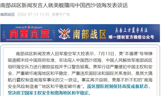 据中国人民解放军南部战区7月13日消息,南部战区新闻发言人田军里空军大校表示,7月13日,美“本福德”号导弹驱逐舰未经中国政府批准,非法闯入中国西沙领海,中国人民解放军南部战区组织海空兵力进行跟踪监视并予以警告驱离。美军行径严重侵犯中国主权和安全,严重破坏南海地区和平稳定,严重违反国际法和国际关系准则,是其大搞航行霸权制造南海军事化的又一铁证。