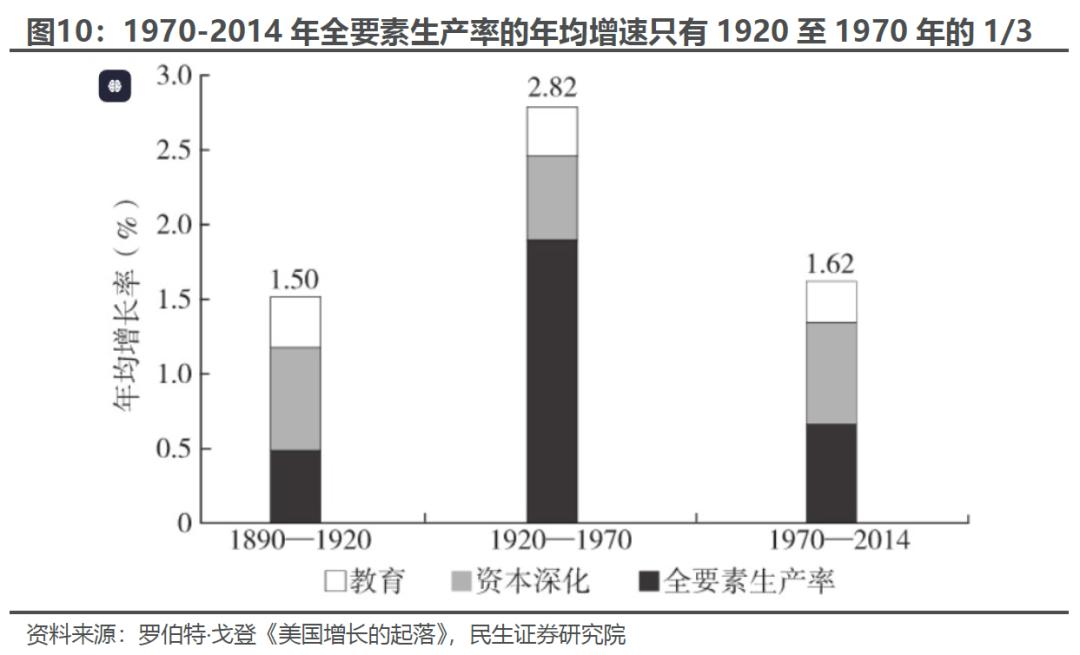 1970年之后美国经济增长和科技进步的力度明显放缓。戈登在《美国增长的起落》中表示“1970年以后的创新步伐已不再像特殊世纪(1870-1970)的发明所推动的那么广泛,那么深入”,1970年之后(至2014年)美国的全要素生产率的年均增速几乎只有1920至1970年的1/3