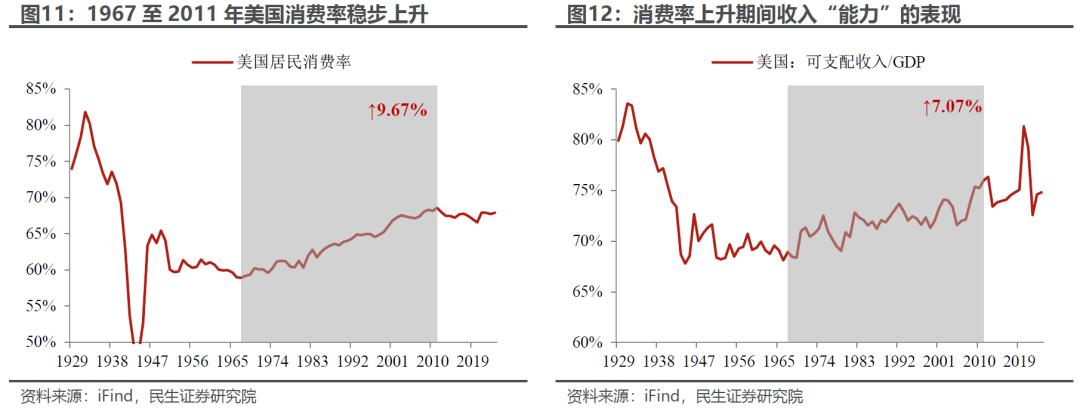 第二种情形,在没有深入的技术革命和爆炸式的增长的背景下,美国的居民消费率的缓慢上升,发生在1967年至2011年之间。