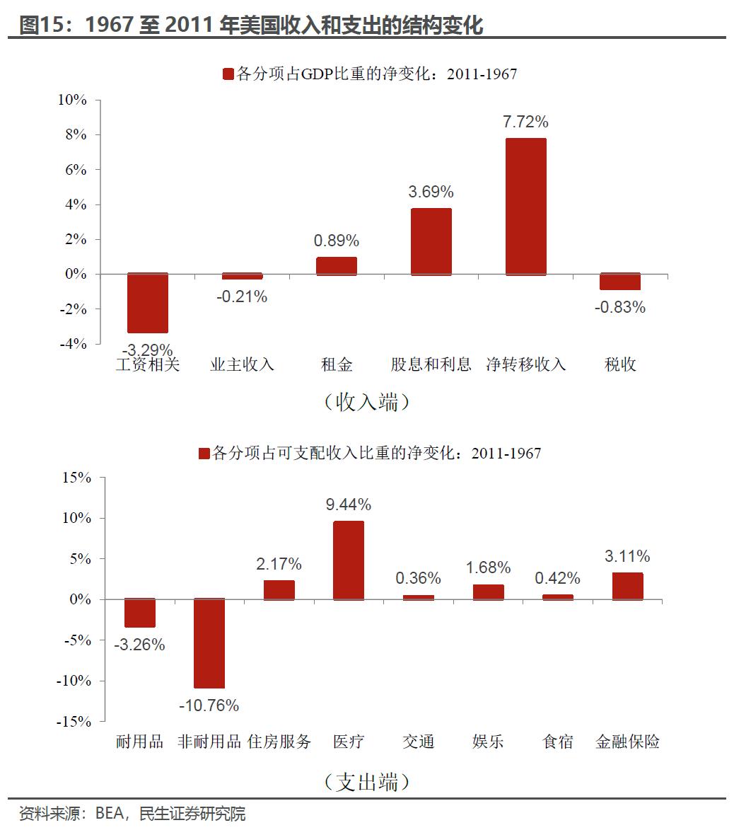 其次,我们进一步去拆分,去看看具体在收入和支出细项上能力和意愿的变化。从整体上看,这是一场由政府驱动的收入和消费变革,最终结果是政府加大补贴、打造了世界上最昂贵的医疗体系之一