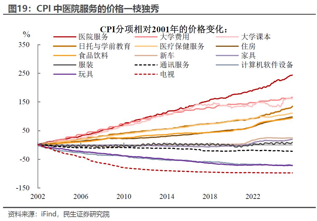 从价格角度,我们去看美国CPI重要分项的表现,2025年医院服务价格相较21世纪初上涨超过200%,傲决群雄。