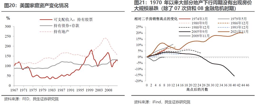 资本市场方面,两个重要的特点:首先,居民持有的股票越来越多,最终在20世纪90年代,持有市值超过年度可支配收入的规模;其次,作为居民重要资产的地产,在此期间虽然屡次出现放缓,但没有出现大规模的房价下跌,直至2007年次贷危机。