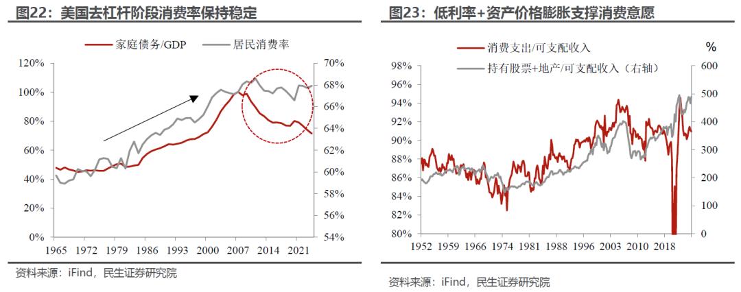 第三种情形,居民去杠杆的情况下消费会怎么走?这主要在2008年之后至2020年前,美国给出的答案是依靠低利率和资产膨胀来稳住消费意愿。当然也会辅以阶段性的减税、补助等财政措施。